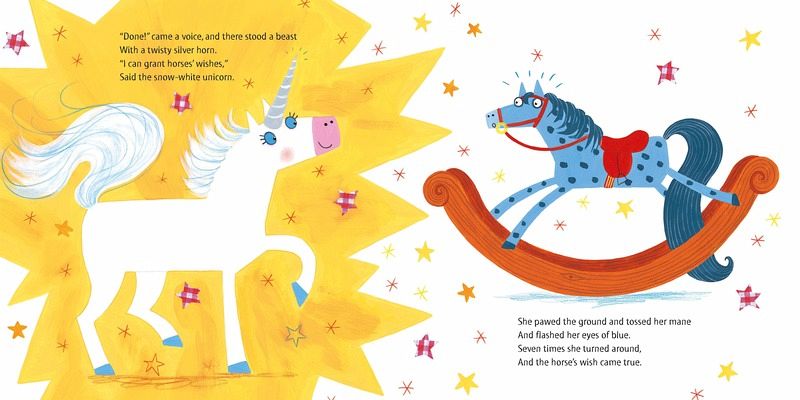 When Sugarlump the rocking horse longs to see the world, a magical unicorn with a silver horn and sparkling blue eyes grants his wish and turns him into a real horse. But after trotting around the farm, galloping around a racetrack and even dancing at the circus, Sugarlump learns to be careful what he wishes for. Luckily the unicorn has one more wish to grant . . .
