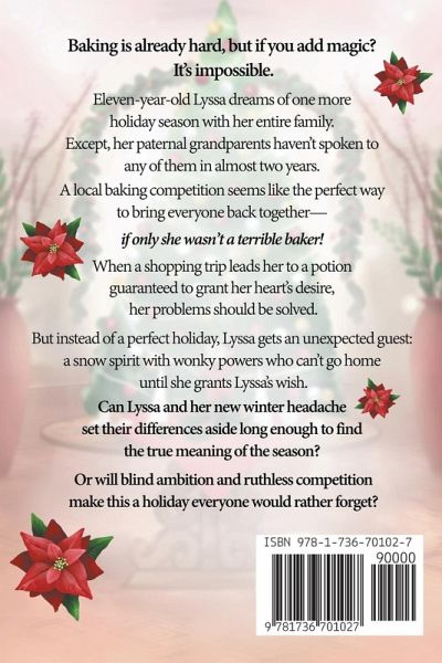Baking is already hard, but if you add magic? It's impossible. Eleven-year-old Lyssa dreams of one more holiday season with her entire family. Except, her paternal grandparents haven't spoken to any of them in almost two years. A local baking competition seems like the perfect way to bring everyone back together-- if only she wasn't a terrible baker! When a shopping trip leads her to a potion guaranteed to grant her heart's desire, her problems should be solved. But instead of a perfect holiday, Lyssa gets an unexpected guest: a snow spirit with wonky powers who can't go home until she grants Lyssa's wish. Can Lyssa and her new winter headache set their differences aside long enough to find the true meaning of the season? Or will blind ambition and ruthless competition make this a holiday everyone would rather forget?