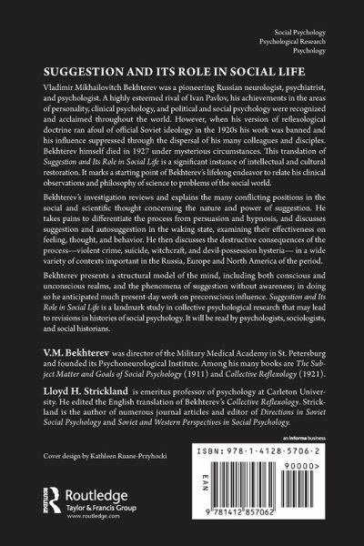 Vladimir Mikhailovitch Bekhterev was a pioneering Russian neurologist, psychiatrist, and psychologist. A highly esteemed rival of Ivan Pavlov, his achievements in the areas of personality, clinical psychology, and political and social psychology were recognized and acclaimed throughout the world. However, when his version of reflexological doctrine ran afoul of official Soviet ideology in the 1920s his work was banned and his influence suppressed through the dispersal of his many colleagues and disciples. Bekhterev himself died in 1927 under mysterious circumstances. This translation of Suggestion and Its Role in Social Life is a significant instance of intellectual and cultural restoration. It marks a starting point of Bekhterev's lifelong endeavour to relate his clinical observations and philosophy of science to problems of the social world.
