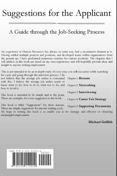 This book is intended to be simple and to the point. There are examples for every suggestion in this book. This is not intended to be an in-depth study of every issue you will encounter while searching for a job and going through the interview process. I do not believe that the average job seeker is concerned with this. I believe the average job seeker wants to know what to do, how to do it, what not to do, and how to avoid it. This book is titled "Suggestions" for these reasons. These are simple suggestions for anyone seeking a job. My hope in writing this book is to enable you to be strategic and effective in obtaining meaningful employment.