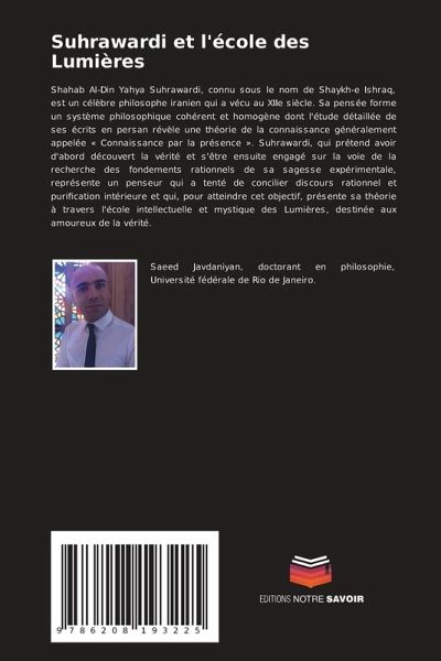 Shahab Al-Din Yahya Suhrawardi, connu sous le nom de Shaykh-e Ishraq, est un célèbre philosophe iranien qui a vécu au XIIe siècle. Sa pensée forme un système philosophique cohérent et homogène dont l'étude détaillée de ses écrits en persan révèle une théorie de la connaissance généralement appelée « Connaissance par la présence ». Suhrawardi, qui prétend avoir d'abord découvert la vérité et s'être ensuite engagé sur la voie de la recherche des fondements rationnels de sa sagesse expérimentale, représente un penseur qui a tenté de concilier discours rationnel et purification intérieure et qui, pour atteindre cet objectif, présente sa théorie à travers l'école intellectuelle et mystique des Lumières, destinée aux amoureux de la vérité.