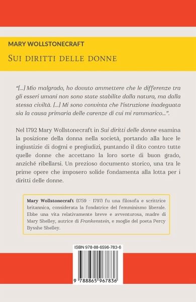 "[...] Mio malgrado, ho dovuto ammettere che le differenze tra gli esseri umani non sono state stabilite dalla natura, ma dalla stessa civiltà. [...] Mi sono convinta che l'istruzione inadeguata sia la causa primaria delle carenze di cui mi rammarico...".Nel 1792 Mary Wollstonecraft in Sui diritti delle donne esamina la posizione della donna nella società, portando alla luce le ingiustizie di dogmi e pregiudizi, puntando il dito contro tutte quelle donne che accettano la loro sorte di buon grado, anziché ribellarsi. Un prezioso documento storico, una tra le prime opere che imposero solide fondamenta alla lotta per i diritti delle donne.