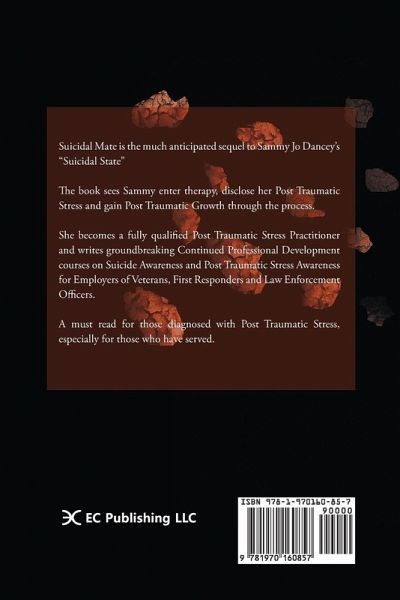 Suicidal mate is the much-anticipated sequel to Sammy Jo Dancey's "Suicidal State" The book sees Sammy enter therapy, disclose her Post Traumatic Stress, and gain Post Traumatic Growth through the process. She becomes a fully qualified Post Traumatic Stress Practitioner and writes groundbreaking Continued Professional Development courses on Suicide Awareness and Post Traumatic Stress Awareness for Employers of Veterans, First Responders, and Law Enforcement Officers. A must-read for those diagnosed with Post Traumatic Stress, especially for those who have served