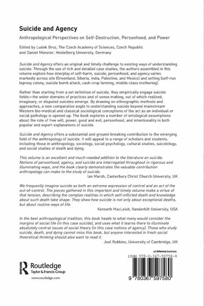 Suicide and Agency offers an original and timely challenge to existing ways of understanding suicide. Through the use of rich and detailed case studies, the authors assembled in this volume explore how interplay of self-harm, suicide, personhood and agency varies markedly across site (Greenland, Siberia, India, Palestine and Mexico) and setting (self-run leprosy colony, suicide bomb attack, cash-crop farming, middle-class mothering). Rather than starting from a set definition of suicide, they empirically engage suicide fields-the wider domains of practices and of sense making, out of which realized, imaginary, or disputed suicides emerge. By drawing on ethnographic methods and approaches, a new comparative angle to understanding suicide beyond mainstream Western bio-medical and classical sociological conceptions of the act as an individual or social pathology is opened up. The book explores a number of ontological assumptions about the role of free will, power, good and evil, personhood, and intentionality in both popular and expert explanations of suicide. Suicide and Agency offers a substantial and ground-breaking contribution to the emerging field of the anthropology of suicide. It will appeal to a range of scholars and students, including those in anthropology, sociology, social psychology, cultural studies, suicidology, and social studies of death and dying.