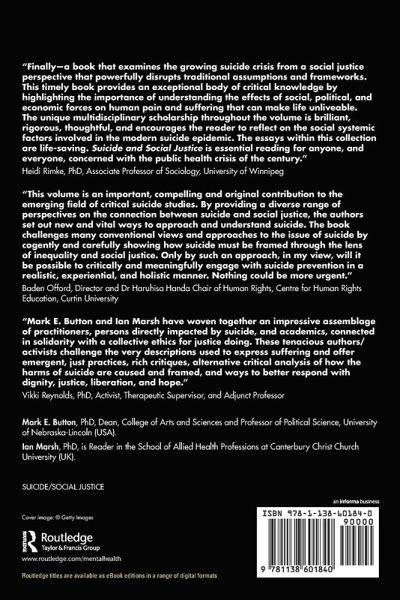 With a focus on social justice, the book seeks to understand the complex interactions between individual and group experiences with suicidality and various social pathologies, including inequality, intergenerational poverty, racism, sexism, and homophobia. Chapters investigate the underlying and often overlooked connections that link rising rates and disproportionate concentrations of suicide within specific populations to wider social, political, and economic conditions.
