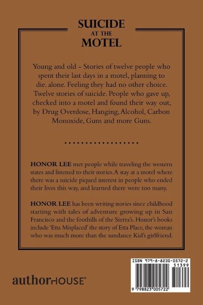 Young and old - Stories of twelve people who spent their last days in a motel, planning to die. alone. Feeling they had no other choice. Twelve stories of suicide. People who gave up, checked into a motel and found their way out, by Drug Overdose, Hanging, Alcohol, Carbon Monoxide, Guns and more Guns.