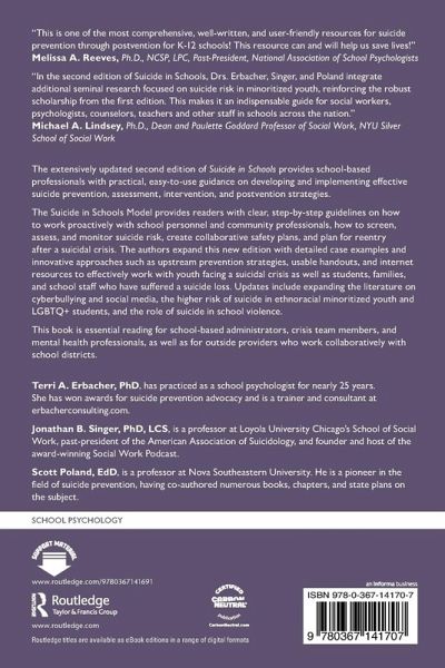 Terri A. Erbacher, PhD, has practiced as a school psychologist for nearly 25 years. She has won awards for suicide prevention advocacy and is a trainer and consultant at erbacherconsulting.com. Jonathan B. Singer, PhD, LCS, is a professor at Loyola University Chicago's School of Social Work, past-president of the American Association of Suicidology, and founder and host of the award-winning Social Work Podcast. Scott Poland, EdD, is a professor at Nova Southeastern University. He is a pioneer in the field of suicide prevention, having co-authored numerous books, chapters, and state plans on the subject.