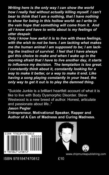 By S Westwood ISBN: 9781847470812 Published: 2007 Pages: 281 Key Themes: suicidal thoughts, abuse, obsessive phobia, borderline personality disorder, depression Description As a survivor of at least six suicide attempts and a habit to self harm the author of this autobiographical novel fights with an obsessive phobia that his skin is hideously ugly and a personality disorder that leads to the edge of despair. He is diagnosed as having Borderline Personality Disorder and severe depression but it is not for a further ten years that his silence regarding his appearance is broken and he is finally diagnosed with Body Dysmorphic Disorder. In the knowledge that his skin problem is a mental disorder rather than a physical deformity the correct medication is, at last, prescribed and the road to recovery begins. This is a strong and emotional but ultimately positive book which will do much to create greater understanding of these widely mis-understood ailments. About the Author S. Westwood grew up in Great Wymondley, a small village near Hitchin in Hertfordshire. He studied at the Thomas Alleyne school in Stevenage and then went on to study at the NH College in Letchworth. Now thirty-one and a full time writer S.Westwood is married to artist Ashley and lives in Letchworth with their chihuahua Tequila. The couple recently lost their daughter Lydia Angel who was born asleep. She is sorely missed. S.Westwood has had mental health problems since childhood and has been diagnosed with having borderline personality disorder, body dysmorphic disorder and severe depression. Now working improve understanding of these largely unknown illnesses; S.Westwood hopes that his writing will connect with fellow sufferers Book Extract My childhood was not bad on the face of things. I was not abused. I was not neglected. Our family was not particularly impoverished, though certainly not well off. I remember many things fondly and still love many of those things that the child Stephen held dear. I may have grown out of wanting to be a cowboy but there are films I went to see at the cinema when I was a child that I have since bought on DVD and watch regularly. I think that is true for a lot of people. What we loved as a child shapes our personality and you can definitely tell what sort of person someone is simply by whether they do or do not like 'Labyrinth'. Why should we, as 'grown ups' lose the magic of innocence? Many of us still hold on to those feelings and by watching those films or listening to the music we grew up with we can recall those chaste emotions. Things look better in a mask of nostalgia. I may have cried and been taken out of the cinema when I watched Star Wars for the first time but at least I can boast that I saw all three films of the holy trilogy on the big screen. Adam Ant may have lost his looks and gone a little insane, but he will always be cool to me and the Muppet show will always be the most perfect family entertainment.