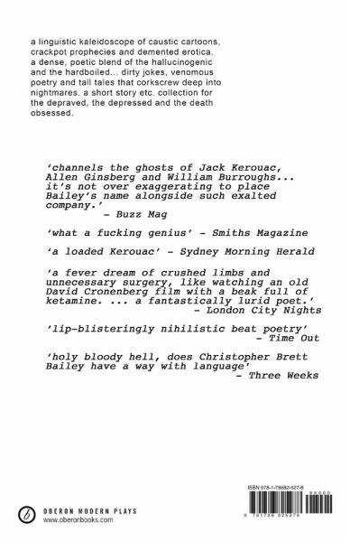 A linguistic kaleidoscope of caustic cartoons, crackpot prophecies and demented erotica. A dense, poetic blend of the hallucinogenic and the hardboiled... dirty jokes, venomous poetry and tall tales that corkscrew deep into nightmares. A short story etc. collection for the depraved, the depressed and the death obsessed.