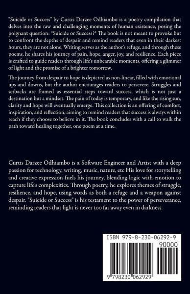 "Suicide or Success" by Curtis Darzee Odhiambo is a poetry compilation that delves into the raw and challenging moments of human existence, posing the poignant question: *Suicide or Success?* The book is not meant to provoke but to confront the depths of despair and remind readers that even in their darkest hours, they are not alone. Writing serves as the author's refuge, and through these poems, he shares his journey of pain, hope, anger, joy, and resilience. Each piece is crafted to guide readers through life's unbearable moments, offering a glimmer of light and the promise of a brighter tomorrow. The journey from despair to hope is depicted as non-linear, filled with emotional ups and downs, but the author encourages readers to persevere. Struggles and setbacks are framed as essential steps toward success, which is not just a destination but a mindset. The pain of today is temporary, and like the rising sun, clarity and hope will eventually emerge. This collection is an offering of comfort, inspiration, and reflection, aiming to remind readers that success is always within reach if they choose to believe in it. The book concludes with a call to walk the path toward healing together, one poem at a time.