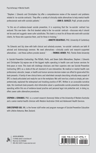Suicide Prevention Contracting: The Pitfalls, Perils, and Seven Safer Alternatives demonstrates that suicide prevention contracting, a widely adopted but little-understood form of suicide prevention, is almost wholly counterproductive and potentially dangerous for both patients and the clinician attempting to assist them. Edwards and Goj make a compelling case for this alarming pronouncement and offer seven alternative procedures.