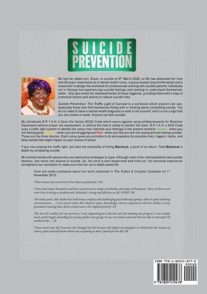 MJ lost her eldest son, Bryan, to suicide on 6th March 2020, so MJ has dedicated her time and 28 years' experience as a mental health nurse, a group analyst (psychotherapist) and a researcher to design this workbook for professionals working with suicidal patients; individuals not in therapy but experiencing suicidal feelings and seeking to understand themselves better. She also writes for relatives/friends of those triggered, providing them with a map of protective factors and actions to reduce suicide risks. Suicide Prevention: The Traffic Light of Survival is a workbook which anyone can use, especially those who find themselves flirting with or thinking about committing suicide. You do not need to have a mental health diagnosis to want to kill yourself, and it is not a sign that you are insane or weak. Anyone can feel suicidal. MJ introduces B.R.Y.A.N.'s Save Our Sanity (SOS) Code which warns against using antidepressants for Reactive Depression without proper risk assessment, or without the time or ability to monitor the client. B.R.Y.A.N.'s SOS Code uses a traffic light system to identify the colour that matches your feelings in the present moment: Green - when you are feeling good; Amber - when you are struggling and Red - when you feel you are not coping and are feeling suicidal. Those are the three choices. Each colour gives you activities to do and explains the possible risks, triggers, myths, and false beliefs that might impact on your choice of action. If you risk jumping the traffic light, you face the possibility of hitting Blackout, a point of no return. Total Blackout is death by completing suicide. MJ worked mostly with people who use destructive strategies to cope. Although most of her clients/patients had suicidal ideation, she never lost anyone to suicide. So, her work is well researched and tried out. Her personal experience strengthens her motivation to make sure that her son's death saves life.
