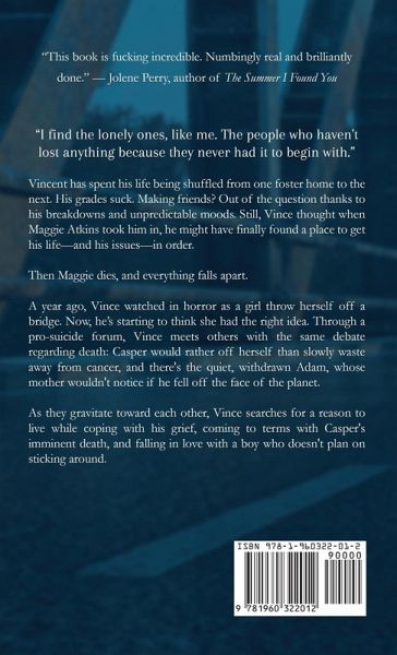 Vincent has spent his entire life being shuffled from one foster home to the next. His grades suck. Making friends? Out of the question thanks to his nervous breakdowns and unpredictable moods. Still, Vince thought when Maggie Atkins took him in, he might've finally found a place to get his life-and his issues-in order. When Maggie dies, it all falls apart. A year ago, Vince watched a girl leap to her death off a bridge. He's starting to think she had the right idea. Through a pro-suicide forum, Vince meets others with the same debate regarding death: cancer-ridden Casper would rather off herself than slowly waste away, and there's quiet, withdrawn Adam, whose mother wouldn't notice if he fell off the face of the planet. As they gravitate toward each other, Vince searches for a reason to live while coping without Maggie, coming to terms with Casper's imminent death, and falling in love with a boy who doesn't plan on sticking around.