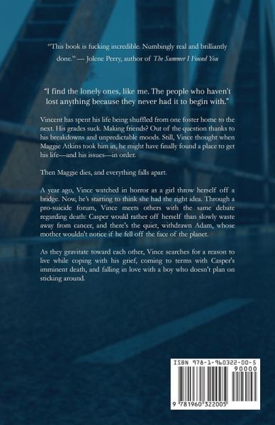 Vincent has spent his entire life being shuffled from one foster home to the next. His grades suck. Making friends? Out of the question thanks to his nervous breakdowns and unpredictable moods. Still, Vince thought when Maggie Atkins took him in, he might've finally found a place to get his life-and his issues-in order. When Maggie dies, it all falls apart. A year ago, Vince watched a girl leap to her death off a bridge. He's starting to think she had the right idea. Through a pro-suicide forum, Vince meets others with the same debate regarding death: cancer-ridden Casper would rather off herself than slowly waste away, and there's quiet, withdrawn Adam, whose mother wouldn't notice if he fell off the face of the planet. As they gravitate toward each other, Vince searches for a reason to live while coping without Maggie, coming to terms with Casper's imminent death, and falling in love with a boy who doesn't plan on sticking around.