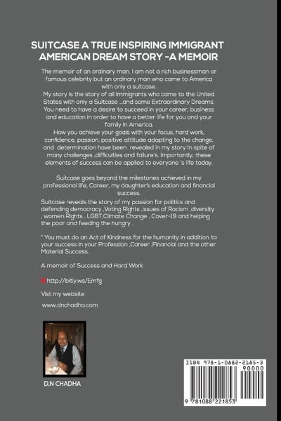The memoir of an ordinary man . I am not a rich businessman or famous celebrity but an ordinary man who came to America with only a Suitcase.My story is the story of all Immigrants who came to America with only a suitcase ...and some Extraordinary dreams .You have a desire and goals to succeed in your career ,business and education in order to have a better life for you and your family in America . How you achieve your goals with your focus, hard work ,confidence .passion ,positive attitute adapting to the change , and determination have been revealed in my story Inspite of many challenges ,dificulteis and failure's. Importantly , these elements of success can be applied to everyone 's life today .Suitcase goes beyond the milestones achieved in in my professional life ,Career, my daughters education and financial success . Suitcase reveals the story of my passion for politics and defending democracy , Voting Rights, issues of racism, diversity , women rights ,LGBT ,climate change , Covid -19 and Helping the poor and feeding the hungry .My journey seeks for the Health Wealth and Prosperity of the World community and humanity