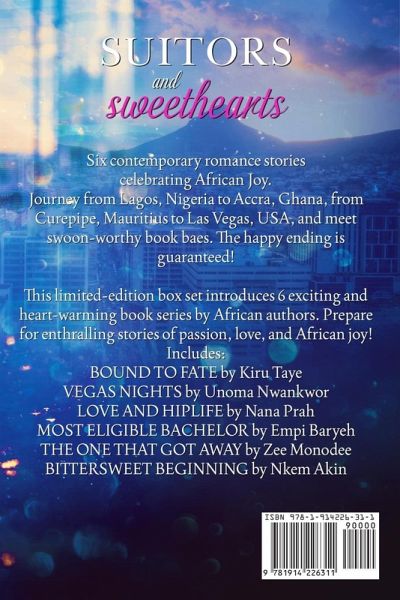 6 contemporary romance stories celebrating African Joy. Journey from Lagos, Nigeria to Accra, Ghana, from Curepipe, Mauritius to Las Vegas, USA, and meet swoon-worthy book baes. The happy ending is guaranteed! This limited-edition box set introduces 6 exciting and heart-warming book series by African authors. Prepare for enthralling stories of passion, love, and African joy! Tropes: second chance romance, forbidden love, one-night stand, rockstar romance, and billionaires. BOUND TO FATE by Kiru Taye All Ike wants to do is to keep out of trouble and get through the one-year internship required for his degree program. But trouble finds him, in the form of the intelligent and brave Lara who turns his world upside down. Falling in love is forbidden. So why does it feel so right? Love like theirs cannot be denied. But catastrophe lies in wait and one-night changes their lives forever. VEGAS NIGHTS by Unoma Nwankwor A woman scared of being hurt again is bent on playing it safe. A man determined to stay focused and never experience poverty again. One night on the wild side that changes everything. LOVE AND HIPLIFE by Nana Prah Blaise is on the verge of taking African Francophone countries by storm with his new style of music. Learning how to sing in French without butchering the beautiful language is harder than he thought. Multi-linguist, Lamisi is the key to his success. When his presence in her life puts her in danger, will he end the budding relationship in order to keep her safe? MOST ELIGIBLE BACHELOR by Empi Baryeh When Lord-his given name, not a title-sets his sights on Chantelle, he has more than work on his mind. Yet, even the infamous playboy couldn't have predicted the magnetic attraction from the moment they met, nor the evening ending with more than just an interview. But now he has to convince Chantelle that their one-night stand wasn't a mistake... and that not all bachelors are heartbreakers. THE ONE THAT GOT AWAY by Zee Monodee Eldest sister of the Hemant sibling trio, Lara, returns to Mauritius as a divorcee and she comes across Eric, the man she loved as a teenager and gave up because their interracial relationship would not stand a chance on this island. But here comes a second chance: Eric wants her back in his life, and he will stop at nothing to win her back. Will Lara be her own worst enemy and thus end up unhappy ever after? BITTERSWEET BEGINNING by Nkem Akin "Efe Sagay grew up and went to school in Nigeria. While attending school she met the love of her life, her soul mate, the person she wanted to spend the rest of her life with...Kevwe Mukoro. And the feelings were duplicated by Kevwe. As soon as Efe graduated, they would be married. This was the dream and this was the plan. But real life doesn't always see things the way we do. The perfect future can always be destroyed by unforeseen circumstances." ~ Martha A. Cheves, Author.