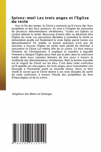 Vers la fin des temps, le Christ a annoncé qu'il y'aura des faux prophètes et des faux pasteurs. Ils sont à l'origine de naissance de plusieurs dénominations chrétiennes. Toutes ces Églises se croient détenir la vérité. Beaucoup d'entre elles se déclarent être l'Église du reste. Les personnes décidées à connaître la vérité se demandent quelle est finalement la vraie Église parmi toutes ces dénominations? En réalité, la bonne question n'est pas de chercher à trouver l'Église de vérité mais plutôt de chercher à rencontrer le Christ Lui-même afin de Le suivre. Ce livre retrace l'histoire du Christianisme. Il explique la manière à laquelle l'ennemi a attaqué l'Église pour finir par la jeter dans la confusion totale dont nous sommes témoins de nos jours à travers la multitude des dénominations chrétiennes. Mais la bonne nouvelle est le regard du Christ sur les élus. C'est dans cette confusion qu'Il appelle ses messagers, les trois anges, pour transmettre son message à l'humanité avant sa seconde venue. Ainsi, ce livre révèle le secret que le Christ donne à ces vrais disciples de sortir de cette confusion, à travers l'étude des prophéties du livre d'Apocalypse, et de Le suivre.