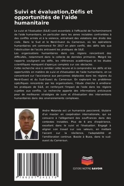 Le suivi et l'évaluation (S&E) sont essentiels à l'efficacité de l'acheminement de l'aide humanitaire, en particulier dans les zones instables confrontées à des conflits armés et à la violence, entraînant des violations des droits des civils. Dans le Sud et le Nord-Ouest du Cameroun, où les opérations humanitaires ont commencé fin 2017 en plein conflit, des défis tels que l'obstruction de l'accès entravent les pratiques de S&E.Les organisations humanitaires dans ces régions rencontrent des difficultés, notamment dans la collecte de données primaires. Malgré les rapports soulignant ces défis, les références académiques et les études scientifiques manquent d'aperçus complets sur ces obstacles.Cette recherche vise à combler cette lacune et à comprendre les défis et les opportunités en matière de suivi et d'évaluation de l'aide humanitaire, en se concentrant sur l'assistance aux personnes déplacées dans les régions du Nord-Ouest et du Sud-Ouest du Cameroun. En explorant les problèmes spécifiques rencontrés par les organisations, l'étude cherche à améliorer les pratiques de S&E, en renforçant l'impact de l'aide dans les régions sujettes aux conflits. La recherche apporte des informations précieuses pour de meilleures stratégies de suivi et d'évaluation des interventions humanitaires dans des environnements complexes.
