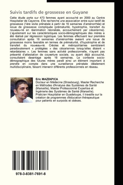 Cette étude porte sur 473 femmes ayant accouché en 2000 au Centre Hospitalier de Cayenne. Elle recherche une association entre suivi tardif de grossesse (1ère visite prénatale à partir de 16 semaines d aménorrhée) et issue de grossesse compliquée (prématurité, hypotrophie, transfert du nouveau-né en réanimation néonatale, accouchement par césarienne). L ajustement sur les caractéristiques socio-démographiques des mères a été réalisé par régression logistique. Les femmes effectuant leur première consultation après 16 semaines d aménorrhée avaient une issue de grossesse moins favorable en termes de prématurité, d hypotrophie et de transfert du nouveau-né. Créoles et métropolitaines semblaient paradoxalement " protégées " des césariennes lorsqu elles étaient " retardataires ". Les femmes sans activité professionnelle, n ayant pas présenté d attestation de couverture sociale, ou ayant déjà accouché, consultaient davantage après 16 semaines. Le contexte socio-démographique des futures mères paraît ainsi un élément important à prendre en compte dans une surveillance prénatale idéalement multidisciplinaire, faisant intervenir différents professionnels en réseau.