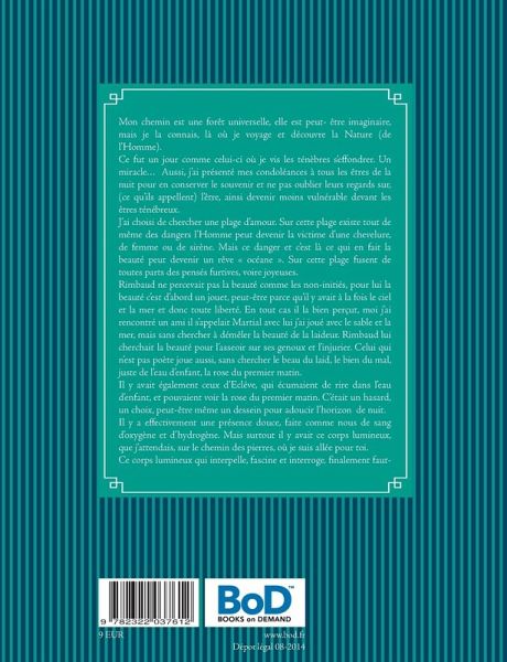 Mon chemin est une forêt universelle, elle est peut- être imaginaire, mais je la connais, là où je voyage et découvre la Nature (de l'Homme).Ce fut un jour comme celui-ci où je vis les ténèbres s'effondrer. Un miracle... Aussi, j'ai présenté mes condoléances à tous les êtres de la nuit pour en conserver le souvenir et ne pas oublier leurs regards sur, (ce qu'ils appellent) l'être, ainsi devenir moins vulnérable devant les êtres ténébreux.J'ai choisi de chercher une plage d'amour. Sur cette plage existe tout de même des dangers l'Homme peut devenir la victime d'une chevelure, de femme ou de sirène. Mais ce danger et c'est là ce qui en fait la beauté peut devenir un rêve « océane ». Sur cette plage fusent de toutes parts des pensés furtives, voire joyeuses.Rimbaud ne percevait pas la beauté comme les non-initiés, pour lui la beauté c'est d'abord un jouet, peut-être parce qu'il y avait à la fois le ciel et la mer et donc toute liberté. En tout cas il la bien perçut, moi j'ai rencontré un ami il s'appelait Martial avec lui j'ai joué avec le sable et la mer, mais sans chercher à démêler la beauté de la laideur. Rimbaud lui cherchait la beauté pour l'asseoir sur ses genoux et l'injurier. Celui qui n'est pas poète joue aussi, sans chercher le beau du laid, le bien du mal, juste de l'eau d'enfant, la rose du premier matin.Il y avait également ceux d'Ecléve, qui écumaient de rire dans l'eau d'enfant, et pouvaient voir la rose du premier matin. C'était un hasard, un choix, peut-être même un dessein pour adoucir l'horizon de nuit.Il y a effectivement une présence douce, faite comme nous de sang d'oxygène et d'hydrogène. Mais surtout il y avait ce corps lumineux, que j'attendais, sur le chemin des pierres, où je suis allée pour toi.Ce corps lumineux qui interpelle, fascine et interroge, finalement faut-il suivre le chemin ? Faut-il être ou ne pas être ?