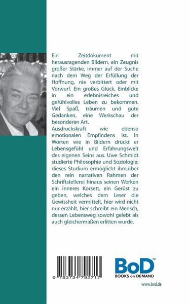 Ein Zeitdokument mit herausragenden Bildern, ein Zeugnis großer Stärke, immer auf der Suche nach dem Weg der Erfüllung der Hoffnung, nie verbittert oder mit Vorwurf. Ein großes Glück, Einblicke in ein erlebnisreiches und gefühlvolles Leben zu bekommen.Viel Spaß, träumen und gute Gedanken, eine Werkschau der besonderen Art.Die Hilfestellung, die ihm zur Seite geht, "in erlebnisreichen Worten" nachgerade zu malen, rührt daher, dass er gleichfalls als Zeichner und Maler ein Könner von starkerAusdruckskraft wie ebenso emotionalen Empfindens ist. In Worten wie in Bildern drückt er Lebensgefühl und Erfahrungswelt des eigenen Seins aus. Uwe Schmidt studierte Philosophie und Soziologie; dieses Studium ermöglicht ihm, über den rein narrativen Rahmen der Schriftstellerei hinaus seinen Werken ein inneres Korsett, ein Gerüst zu geben, welches dem Leser die Gewissheit vermittelt, hier wird nicht nur erzählt, hier schreibt ein Mensch, dessen Lebensweg sowohl gelebt als auch gleichermaßen erlitten wurde. Gerade diese Verbindung macht seine schriftstellerischen Werke, ob Dichtkunst, ob Prosa zu einem faszinierenden Erlebnis. Den Leser verlangt es nach mehr!