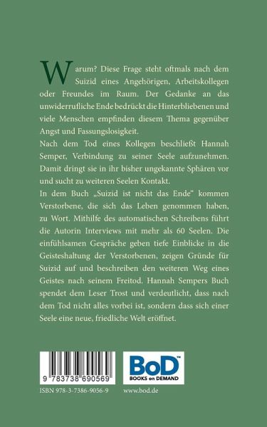 Warum? Diese Frage steht oftmals nach dem Suizid eines Angehörigen, Arbeitskollegen oder Freundes im Raum. Der Gedanke an das unwiderrufliche Ende bedrückt die Hinterbliebenen und viele Menschen empfinden diesem Thema gegenüber Angst und Fassungslosigkeit.Nach dem Tod eines Kollegen beschließt Hannah Semper, Verbindung zu seiner Seele aufzunehmen. Damit dringt sie in ihr bisher ungekannte Sphären vor und sucht zu weiteren Seelen Kontakt.In dem Buch "Suizid ist nicht das Ende" kommen Verstorbene, die sich das Leben genommen haben, zu Wort. Mithilfe des automatischen Schreibens führt die Autorin Interviews mit mehr als 60 Seelen. Die einfühlsamen Gespräche geben tiefe Einblicke in die Geisteshaltung der Verstorbenen, zeigen Gründe für Suizid auf und beschreiben den weiteren Weg eines Geistes nach seinem Freitod. Hannah Sempers Buch spendet dem Leser Trost und verdeutlicht, dass nach dem Tod nicht alles vorbei ist, sondern dass sich einer Seele eine neue, friedliche Welt eröffnet.