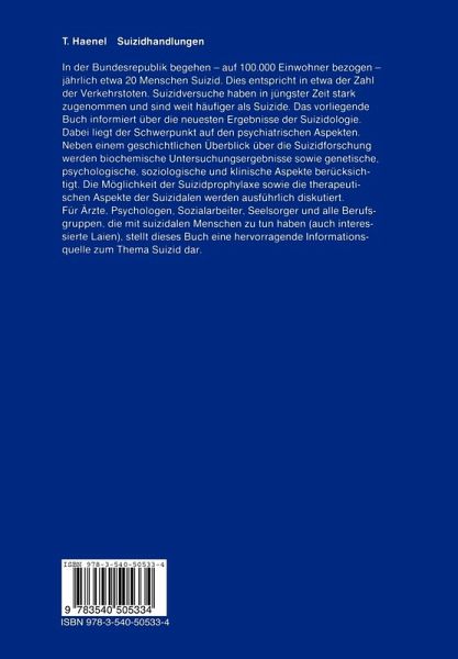 Einleitende Bemerkungen.- Bewertung von Suizidhandlungen und Suizidprävention im Wandel der Zeiten.- Der Suizid im Altertum.- Mittelalter und Neuzeit.- Der Suizid als Gruppen- und Kollektivphänomen.- Der Suizid bei Natur- und außereuropäischen Völkern.- Suizidhandlungen als strafbare Delikte.- Suizidverhütung im Wandel der Zeit.- Suizidhandlungen bei Kindern und Jugendlichen.- Statistische Angaben.- Suizidhandlungen bei schizophrenen Jugendlichen.- Kinder und das präsuizidale Syndrom.- Ursachen und Hintergründe von Suizidhandlungen.- Methoden.- Zwei Beispiele aus der Literatur: von Mark Twain und Stefan Zweig.- Theapie und Prävention.- Statistik und Epidemiologie von Suizidhandlungen.- Grundsätzliches zur Suizidstatistik.- Suizidmethoden.- Epidemiologie.- Der Suizidversuch.- Basler Untersuchungen an nach Suizidversuch hospitalisierten Patienten.- Erkennung und richtige Einschätzung der Suizidalität.- Methoden der Beurteilung.- Krisen und suizidale Entwicklung.- Das präsuizidale Syndrom.- Das suizidale Achsensyndrom.- Risikogruppen.- Suizidhandlungen bei Betagten.- Der Suizid Stefan Zweies.- Chronischer Suizid.- Anorexia nervosa.- Drogenabhängigkeit.- Fokaler Suizid.- Die Haut als Ausdrucksorgan.- Dermatitis artefacta.- Kasuistik.- Diagnostische und psychodynamische Betrachtungen.- Therapeutische Aspekte.- Hintergründe von Suizidhandlungen: Motive und Theorien.- Narzißmus und Suizidalität.- Ambivalenz, bewußte und unbewußte Motive.- Suizidtheorien.- Zur Frage der Autonomie bei Suizidhandlungen.- Unbewußte Suizidhandlungen.- Autonomie und Institution.- Der Bilanzsuizid.- Definitionsversuche und Kommentare.- Kasuistik.- Der "politische" Suizid.- Der "Bilanzanteil" eines Suizides.- Wirken Suizidhandlungen "ansteckend"?.- Der Einfluß derPresse auf Suizidhandlungen.- Nachweis der "ansteckenden" Wirkung durch "fiktive Modelle".- Beispiele für "ansteckende" Effekte.- Suizidhandlungen und Musik.- "Trauriger Sonntag".- Biochemische Aspekte der Suizidalität.- Voraussetzungen zum biochemischen Verständnis.- Monoamine und ihre Metaboliten.- Die Achse Hypothalamus/Hypophyse/Nebennierenrinde.- Untersuchungen von Patienten nach Suizidversuch.- Therapeutische Aspekte.- Unterliegen Suizidhandlungen genetischen Faktoren?.- Prophylaktische und therapeutische Aspekte bei Suizidalen.- Suizidoroohvlaxe.- Maßnahmen bei akuter Suizidalität.- Psychooharmakotherapie.- Was geschieht mit den Hinterbliebenen?.- Suizid und Religion.- Suizide im Alten Testament.- Judas, Pilatus und Opfertod.- "Der Pilatussee".- Die Einstellung der katholischen Kirche zu Suizidhandlungen.- Kann Religion suizidhemmend wirken?.- Zur Problematik der Sterbehilfe.- Literatur.- Namenverzeichnis.