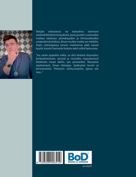 Tekijän esikoisteos on kokoelma olemisen sietämättömästä leveydestä, jossa puolen vuosisadan matkaa taitetaan yksinäisyyden ja ihmissuhteiden umpisolmukohdissa. Ilman mutkia matka on mitätön. Arjen ontologiassa torson molemmat päät saavat kyytiä, kosolti harmaita hiuksia sekä sulkia hattuunsa. "Jos saisin ajopelini valita, se olisi lentävä räsymatto: korkealentoinen, sävyisä ja reunoilta rispaantunut! Matkaisin maan ääriin, sen poveenkin. Reissaisin rajattomasti, ilman ikärajoja. Syöksyisin kuviin ja kertomuksiin. Ylettyisin ulottuvuuksiin, ajassa ees taas..."