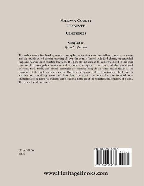 The author took a first-hand approach to compiling a list of seventy-nine Sullivan County cemeteries and the people buried therein, traveling all over the county "armed with field glasses, topographical maps and hearsay about cemetery locations." It is possible that some of the cemeteries listed in this book have vanished from public awareness, and can now, once again, be used as a valuable genealogical reference. Both family and church cemeteries are recorded here; all are listed alphabetically at the beginning of the book for easy reference. Directions are given to thirty cemeteries in the listing. In addition to transcribing names and dates from the stones, the author has also included some inscriptions from memorial markers, and occasional notes about the condition of a cemetery or a stone. The index lists all surnames.