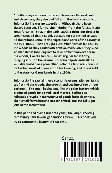 As with many communities in northwestern Pennsylvania and elsewhere, they rise and fall with the local economics. Sulphur Spring was no exception. Although there have always been small farms, virgin timber from the forests made great fortunes. First, in the early 1800s, rafting out timber in streams got all that it could, but Sulphur Spring had to wait till the railroad came to the "upstream" parts of the county in the mid-1800s. They brought out timber from as far back in the woods as they could with draft animals. Later, they used smaller steam train engines to take timber from deeper in the woods, like the famous Climax engines from Corry, bringing it out to the sawmills or train depots until all the valuable timber was gone. Then, after the land was clear cut for timber, most of it was not fit for farming, and it was sold to the state for Game Lands in the 1900s. Sulphur Spring saw all these economic events; pioneer farms cut from virgin woods, the growth and decline of the timber business. The small businesses, like the paint factory, which produced goods for a small local market, declined as railroads brought in manufactured goods from elsewhere. Then small farms became uneconomical, and the folks got jobs in the local towns. In this period of over a hundred years, the Sulphur Spring community saw several generations thrive. This book will try to capture the history of that time.