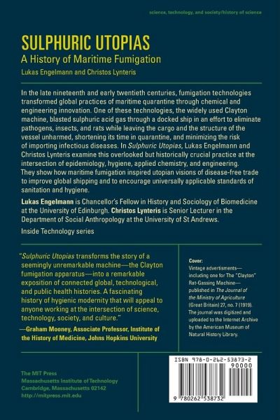 How early twentieth century fumigation technologies transformed maritime quarantine practices and inspired utopian visions of disease-free global trade. In the late nineteenth and early twentieth centuries, fumigation technologies transformed global practices of maritime quarantine through chemical and engineering innovation. One of these technologies, the widely used Clayton machine, blasted sulphuric acid gas through a docked ship in an effort to eliminate pathogens, insects, and rats while leaving the cargo and the structure of the vessel unharmed, shortening its time in quarantine and minimizing the risk of importing infectious diseases. In Sulphuric Utopias, Lukas Engelmann and Christos Lynteris examine this overlooked but historically crucial practice at the intersection of epidemiology, hygiene, applied chemistry, and engineering. They show how maritime fumigation inspired utopian visions of disease-free trade to improve global shipping and to encourage universally applicable standards of sanitation and hygiene. Engelmann and Lynteris chart the history of ideas about fumigation, disinfection, and quarantine, and chronicle the development of the Clayton machine in 1880s New Orleans. Built by the Louisiana Board of Health and adapted and patented by Thomas Clayton, the machine offered a barrier against bacteria and pests and enabled a highway to global trade. Engelmann and Lynteris chronicle the Clayton machine's success and examine its competitors, including carbon-based fumigation methods in Germany and the Ottoman Empire as well as the "Sulfurozador” in Argentina. They follow the international standardization of maritime fumigation and explore the Clayton machine's decline after World War I, when visions of "sulphuric utopia” were replaced by a pragmatic acknowledgment of epidemiological complexity.