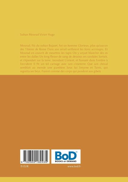Sultan Mourad Victor HugoSultan MouradLa Légende des siècles, Hetzel, 1859 (p. 253-266).Mourad, fils du sultan Bajazet, fut un homme Glorieux, plus qu'aucun des Tibères de Rome Dans son sérail veillaient les lions accroupis, Et Mourad en couvrit de meurtres les tapis On y voyait blanchir des os entre les dalles Un long fleuve de sang de dessous ses sandales Sortait, et s'épandait sur la terre, inondant L'orient, et fumant dans l'ombre à l'occident Il fit un tel carnage avec son cimeterre Que son cheval semblait au monde une panthère Sous lui Smyrne et Tunis, qui regretta ses beys, Furent comme des corps qui pendent aux gibets Il fut sublime il prit, mêlant la force aux ruses, Le Caucase aux Kirghis et le Liban aux Druses Il fit, après l'assaut, pendre les magistrats D'Éphèse, et rouer vifs les prêtres de Patras Grâce à Mourad, suivi des victoires rampantes, Le vautour essuyait son bec fauve aux charpentes Du temple de Thésée encor pleines de clous Grâce à lui, l'on voyait dans Athènes des loups, Et la ronce couvrait de sa verte tunique Tous ces vieux pans de murs écroulés, Salonique, Corinthe, Argos, Varna, Tyr, Didymothicos, Où l'on n'entendait plus parler que les échos Mourad fut saint il fit étrangler ses huit frères Comme les deux derniers, petits, cherchaient leurs mères Et s'enfuyaient, avant de les faire mourir Tout autour de la chambre il les laissa courir Mourad, parmi la foule invitée à ses fêtes, Passait, le cangiar à la main, et les têtes S'envolaient de son sabre ainsi que des oiseaux Mourad, qui ruina Delphe, Ancyre et Naxos, Comme on cueille un fruit mûr tuait une province Il anéantissait le peuple avec le prince, Les temples et les dieux, les rois et les donjons L'eau n'a pas plus d'essaims d'insectes dans ses joncs Qu'il n'avait de rois et de spectres épiques Volant autour de lui dans les forêts de piques Mourad, fils étoilé de sultans triomphants, Ouvrit, l'un après l'autre et vivants, douze enfants Pour trouver dans leur ventre une pomme volée Mourad fut magnanime il détruisit Élée,