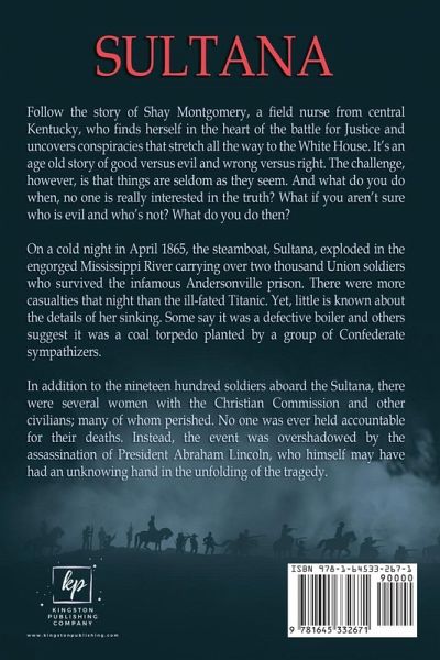 Follow the story of Shay Montgomery, a field nurse from central Kentucky, who finds herself in the heart of the battle for Justice and uncovers conspiracies that stretch all the way to the White House. It's an age old story of good versus evil and wrong versus right. The challenge, however, is that things are seldom as they seem. And what do you do when, no one is really interested in the truth? What if you aren't sure who is evil and who's not? What do you do then? On a cold night in April 1865, the steamboat, Sultana, exploded in the engorged Mississippi River carrying over two thousand Union soldiers who survived the infamous Andersonville prison. There were more casualties that night than the ill-fated Titanic. Yet, little is known about the details of her sinking. Some say it was a defective boiler and others suggest it was a coal torpedo planted by a group of Confederate sympathizers. In addition to the nineteen hundred soldiers aboard the Sultana, there were several women with the Christian Commission and other civilians; many of whom perished. No one was ever held accountable for their deaths. Instead, the event was overshadowed by the assassination of President Abraham Lincoln, who himself may have had an unknowing hand in the unfolding of the tragedy.