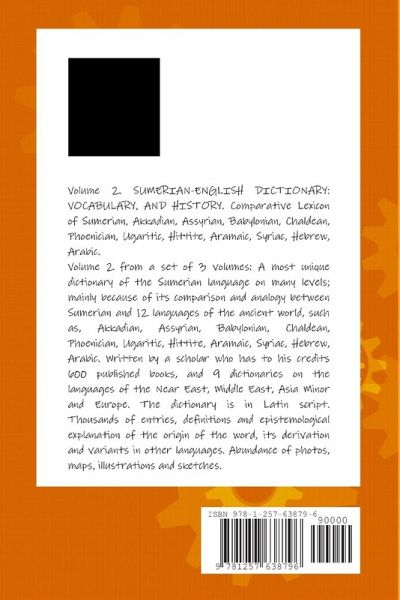 Volume 2. from a set of 3 volumes. SUMERIAN-ENGLISH DICTIONARY: VOCABULARY, AND HISTORY. Comparative Lexicon of Sumerian, Akkadian, Assyrian, Babylonian, Chaldean, Phoenician, Ugaritic, Hittite, Aramaic, Syriac, Hebrew, Arabic. A most unique dictionary of the Sumerian language on many levels; mainly because of its comparison and analogy between Sumerian and 12 languages of the ancient world, such as, Akkadian, Assyrian, Babylonian, Chaldean, Phoenician, Ugaritic, Hittite, Aramaic, Syriac, Hebrew, Arabic. Written by a scholar who has to his credits 600 published books, and 9 dictionaries on the languages of the Near East, Middle East, Asia Minor and Europe. The dictionary is in Latin script. Thousands of entries, definitions and epistemological explanation of the origin of the word, its derivation and variants in other languages. Abundance of photos, maps, illustrations and sketches.