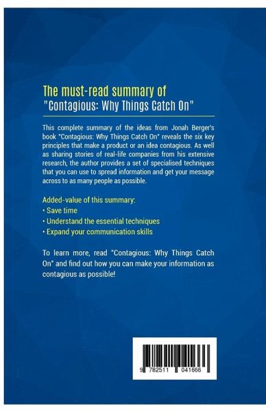 The must-read summary of Jonah Berger's book: "Contagious: Why Things Catch On". This complete summary of the ideas from Jonah Berger's book "Contagious: Why Things Catch On" reveals the six key principles that make a product or an idea contagious. As well as sharing stories of real-life companies from his extensive research, the author provides a set of specialised techniques that you can use to spread information and get your message across to as many people as possible. Added-value of this summary: ¿ Save time ¿ Understand the essential techniques ¿ Expand your communication skills To learn more, read ¿Contagious: Why Things Catch On" and find out how you can make your information as contagious as possible!