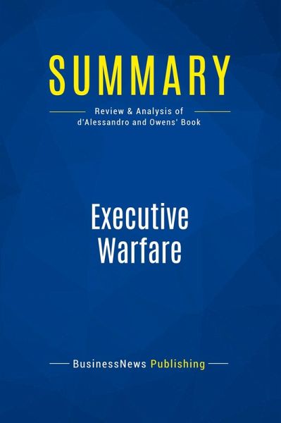 The must-read summary of David D'Alessandro and Michele Owens' book: "Executive Warfare: 10 Rules of Engagement for Winning Your War for Success". This complete summary of the ideas from David D'Alessandro and Michele Owens' book "Executive Warfare" shows how being smart, hard-working and able to generate results will generally get you promoted when you first begin working for an organization. However, once you get to senior management level, these abilities are no longer enough. To keep moving forward at this level, you need to start building relationships with people of influence. In their book, the authors offer ten rules of engagement that you should be using in order to have a chance of rising to the top and staying there. By reading this summary, you will learn the secret to pushing your career further. Added-value of this summary: ¿ Save time ¿ Understand key principles ¿ Expand your knowledge To learn more, read "Executive Warfare" and learn the ten key principles that will put you at the top of the corporate ladder.