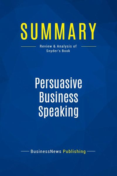 The must-read summary of Elayne Snyder's book: "Persuasive Business Speaking: How to Make Memorable Business Presentations". This complete summary of the ideas from Elayne Snyder's book "Persuasive Business Speaking" shows that for every presentation they make, business speakers should be thoroughly prepared, brief and interesting. In her book, the author explains the importance of each of these features and how you can tailor your presentation to include them all. This summary is a must-read for anyone making a persuasive presentation who wants to win over their audience and leave them impressed. Added-value of this summary: ¿ Save time ¿ Understand key concepts ¿ Expand your business knowledge To learn more, read "Persuasive Business Speaking" and discover the key to delivering quality presentations that will persuade your audience.