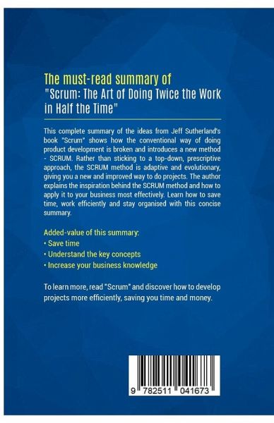 The must-read summary of Jeff Sutherland's book: "Scrum: The Art of Doing Twice the Work in Half the Time". This complete summary of the ideas from Jeff Sutherland's book "Scrum" shows how the conventional way of doing product development is broken and introduces a new method - SCRUM. Rather than sticking to a top-down, prescriptive approach, the SCRUM method is adaptive and evolutionary, giving you a new and improved way to do projects. The author explains the inspiration behind the SCRUM method and how to apply it to your business most effectively. Learn how to save time, work efficiently and stay organised with this concise summary. Added-value of this summary: ¿ Save time ¿ Understand the key concepts ¿ Increase your business knowledge To learn more, read "Scrum" and discover how to develop projects more efficiently, saving you time and money.