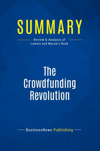 The must-read summary of Kevin Lawton and Dan Marom's book: "The Crowdfunding Revolution: Social Networking Meets Venture Financing". This complete summary of the ideas from Kevin Lawton and Dan Marom's book "The Crowdfunding Revolution" shows that crowdfunding is an innovative, collaborative way to fund projects: it is the fusion of social networking and venture capitalism to obtain funding for worthy causes, get capital for companies in exchange for an equity stake or to pre-sell items to fund production costs. In their book, the authors suggest that crowdfunding has the potential to be even more successful than traditional methods. This summary explains how you can take advantage of collective IQ and wallets, and how to implement this new type of investment model. Added-value of this summary: ¿ Save time ¿ Understand key concepts ¿ Expand your knowledge To learn more, read "The Crowdfunding Revolution" and discover the new, exciting route to funding.