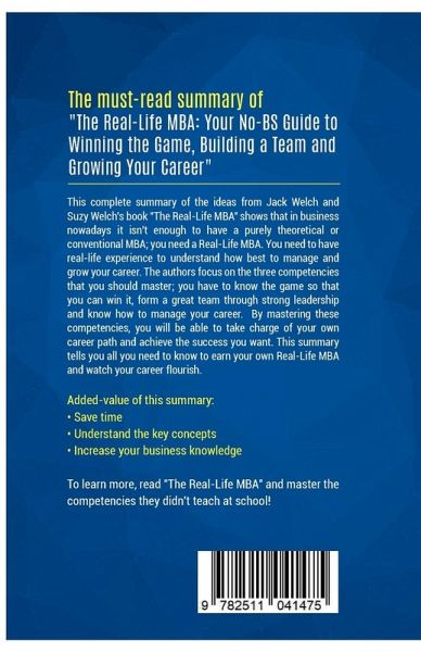 The must-read summary of Jack Welch and Suzy Welch's book: "The Real-Life MBA: Your No-BS Guide to Winning the Game, Building a Team and Growing Your Career". This complete summary of the ideas from Jack Welch and Suzy Welch's book "The Real-Life MBA" shows that in business nowadays it isn't enough to have a purely theoretical or conventional MBA; you need a Real-Life MBA. You need to have real-life experience to understand how best to manage and grow your career. The authors focus on the three competencies that you should master; you have to know the game so that you can win it, form a great team through strong leadership and know how to manage your career. By mastering these competencies, you will be able to take charge of your own career path and achieve the success you want. This summary tells you all you need to know to earn your own Real-Life MBA and watch your career flourish. Added-value of this summary: ¿ Save time ¿ Understand the key concepts ¿ Increase your business knowledge To learn more, read "The Real-Life MBA" and master the competencies they didn't teach at school!