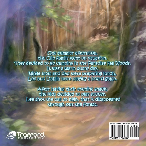 One summer afternoon, the Clip family went on vacation. They decided to go camping in the Paradise Fall Woods. It was a warm sunny day. While mom and dad were preparing lunch, Lee and Dahlia were playing a board game. After having their evening snack, the kids decided to play soccer. Lee shot the ball so high, that it disappeared through out the forest.