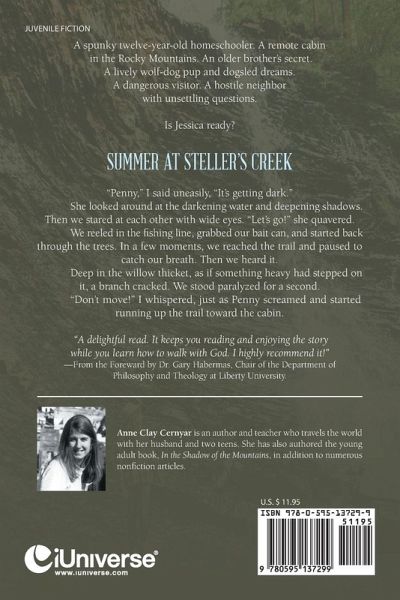 A spunky twelve-year-old homeschooler. A remote cabin in the Rocky Mountains. An older brother's secret. A lively wolf-dog pup and dogsled dreams. A dangerous visitor. A hostile neighbor with unsettling questions. Is Jessica ready? Summer at Steller's Creek "Penny," I said uneasily, "It's getting dark." She looked around at the darkening water and deepening shadows. Then we stared at each other with wide eyes. "Let's go!" she quavered. We reeled in the fishing line, grabbed our bait can, and started back through the trees. In a few moments, we reached the trail and paused to catch our breath. Then we heard it. Deep in the willow thicket, as if something heavy had stepped on it, a branch cracked. We stood paralyzed for a second. "Don't move!" I whispered, just as Penny screamed and started running up the trail toward the cabin. "A delightful read. It keeps you reading and enjoying the story while you learn how to walk with God. I highly recommend it!" -From the Foreward by Dr. Gary Habermas, Chair of the Department of Philosophy and Theology at Liberty University.