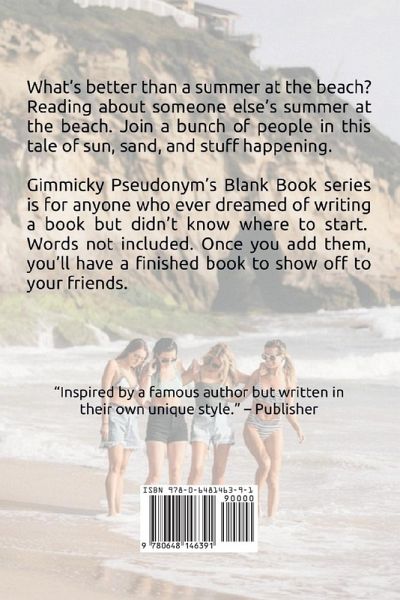 The perfect gift for anyone who has ever talked about writing a book 'one day'. Gimmicky Pseudonym's Blank Book series is for anyone who ever dreamed of writing a book but didn't know where to start. Words not included. Once you add them, you'll have a finished book to show off to your friends. What's better than a summer at the beach? Reading about someone else's summer at the beach. Join a bunch of people in this tale of sun, sand, and stuff happening.