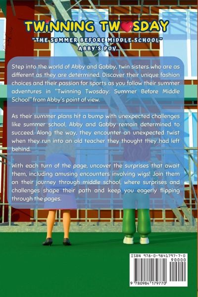 Meet Abby and Gabby, twin sisters with distinct interests and unique tastes in fashion. When their exciting plans for summer are temporarily delayed by Summer School, the girls come up with a plan to make sure they pass. Add a little mischief and Abby's "scheme" takes off. Come discover if their sisterly misadventure will derail their summer plans and lead to ruin. Only time will tell. Why not open the pages of Twinning Twosday: The Summer before Middle School and find out what these sisters have up their sleeves or should I say under their wigs? Come discover if their sisterly misadventure will derail their summer plans and lead to ruin. Only time will tell. Why not open the pages of Twinning Twosday: The Summer before Middle School and find out what these sisters have up their sleeves or should I say under their wigs?