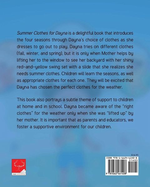 Summer Clothes for Dayna is a delightful book that introduces the four seasons through Dayna's choice of clothes as she dresses to go out to play. Dayna tries on different clothes (fall, winter, and spring), but it is only when Mother helps by lifting her to the window to see her backyard with her shiny red-and-yellow swing set with a slide that she realizes she needs summer clothes. Children will learn the seasons, as well as appropriate clothes for each one. They will be excited that Dayna has chosen the perfect clothes for the weather. This book also portrays a subtle theme of support to children at home and in school. Dayna became aware of the "right clothes" for the weather only when she was "lifted up" by her mother. It is important that as parents and educators, we foster a supportive environment for our children.
