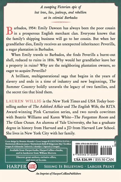 "Tense, atmospheric, and gorgeously written, The Summer Country is a novel to savor!" – Kate Quinn, New York Times bestselling author of The Huntress and The Alice Network A brilliant, multigenerational saga in the tradition of The Thorn Birds and North and South, New York Times bestselling historical novelist Lauren Willig delivers her biggest, boldest, and most ambitious novel yet—a sweeping Victorian epic of lost love, lies, jealousy, and rebellion set in colonial Barbados. Barbados, 1854: Emily Dawson has always been the poor cousin in a prosperous English merchant clan-- merely a vicar’s daughter, and a reform-minded vicar’s daughter, at that. Everyone knows that the family’s lucrative shipping business will go to her cousin, Adam, one day. But when her grandfather dies, Emily receives an unexpected inheritance: Peverills, a sugar plantation in Barbados—a plantation her grandfather never told anyone he owned. When Emily accompanies her cousin and his new wife to Barbados, she finds Peverills a burnt-out shell, reduced to ruins in 1816, when a rising of enslaved people sent the island up in flames. Rumors swirl around the derelict plantation; people whisper of ghosts. Why would her practical-minded grandfather leave her a property in ruins? Why are the neighboring plantation owners, the Davenants, so eager to acquire Peverills? The answer lies in the past— a tangled history of lies, greed, clandestine love, heartbreaking betrayal, and a bold bid for freedom. THE SUMMER COUNTRY will beguile readers with its rendering of families, heartbreak, and the endurance of hope against all odds.