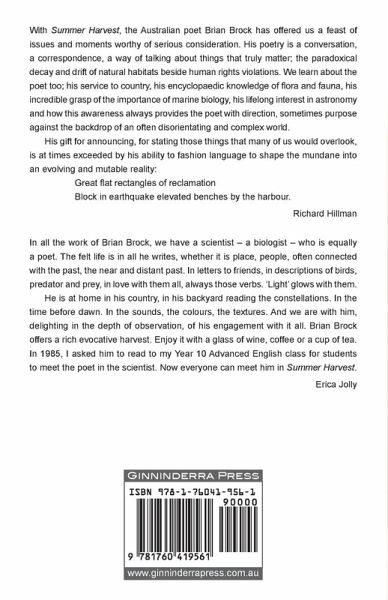 'With Summer Harvest, the Australian poet Brian Brock has offered us a feast of issues and moments worthy of serious consideration. His poetry is a conversation, a correspondence, a way of talking about things that truly matter; the paradoxical decay and drift of natural habitats beside human rights violations. We learn about the poet too; his service to country, his encyclopaedic knowledge of flora and fauna, his incredible grasp of the importance of marine biology, his lifelong interest in astronomy and how this awareness always provides the poet with direction, sometimes purpose against the backdrop of an often disorientating and complex world. His gift for announcing, for stating those things that many of us would overlook, is at times exceeded by his ability to fashion language to shape the mundane into an evolving and mutable reality.' - Richard Hillman 'In all the work of Brian Brock, we have a scientist - a biologist - who is equally a poet. The felt life is in all he writes, whether it is place, people, often connected with the past, the near and distant past. In letters to friends, in descriptions of birds, predator and prey, in love with them all, always those verbs. 'Light' glows with them. He is at home in his country, in his backyard reading the constellations. In the time before dawn. In the sounds, the colours, the textures. And we are with him, delighting in the depth of observation, of his engagement with it all. Brian Brock offers a rich evocative harvest. Enjoy it with a glass of wine, coffee or a cup of tea. In 1985, I asked him to read to my Year 10 Advanced English class for students to meet the poet in the scientist. Now everyone can meet him in Summer Harvest.' - Erica Jolly
