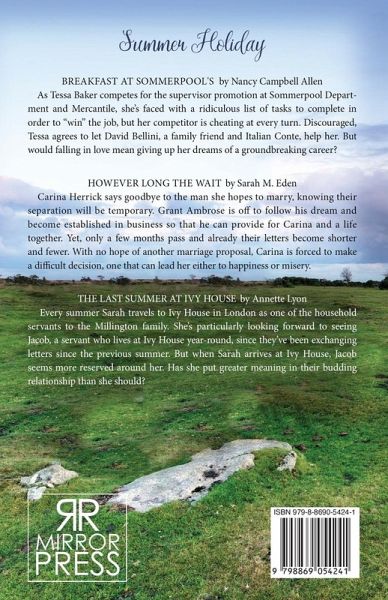 BREAKFAST AT SOMMERPOOL'S by Nancy Campbell Allen:As Tessa Baker competes for the supervisor promotion at Sommerpool Department and Mercantile, she's faced with a ridiculous list of tasks to complete in order to "win" the job. Tessa would love to be the first female supervisor ever to work at the Sommerpool, but her competitor is cheating at every turn. Discouraged, Tessa agrees to let David Bellini, a family friend and Italian Conte who is new in town, help her. When she discovers that he's the new owner of Sommerpool's, but wants to evaluate the employees unobserved, Tessa has mixed feelings. She soon realizes that she's falling for David, but what chance does a working-class woman like her have with an Italian Conte? And would falling in love with the store's owner mean giving up her dreams of a groundbreaking career?HOWEVER LONG THE WAIT by Sarah M. Eden:Carina Herrick says goodbye to the man she hopes to marry, knowing their separation will be temporary. Grant Ambrose is off to follow his dream and become established in business so that he can provide for Carina and a life together. He promises to write; she promises to return his letters. Yet, only a few months pass and already their letters become shorter and fewer. Finally, Carina is forced to give up on Grant if only to protect her breaking heart. Her parents are dead set against her becoming a spinster and insist she accept the proposal of the odious Mr. Baskon. With no hope of another marriage proposal, Carina is forced to make a difficult decision, one that can lead her either to happiness or misery.THE LAST SUMMER AT IVY HOUSE by Annette Lyon:Every summer Sarah travels to Ivy House in London as one of the household servants to the Millington family. This summer, she's particularly looking forward to seeing Jacob, a servant who lives at Ivy House year-round. They've been exchanging letters since the previous summer when their friendship deepened. But when Sarah arrives at Ivy House, Jacob seems more reserved around her and less forthcoming. Has she put greater meaning in their budding relationship than she should? When Sarah discovers that Jacob has a dark secret and wants her to give up her dreams in exchange for helping him, she's not sure if she's willing to make the sacrifice.