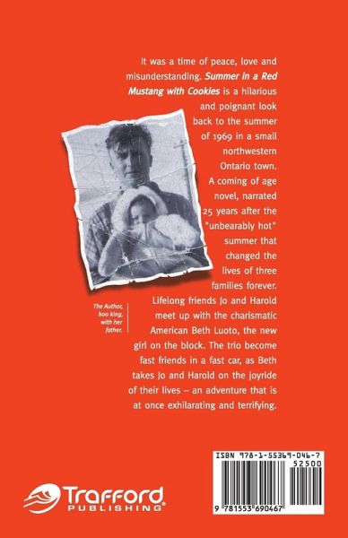 Summer in a Red Mustang with Cookies is a hilarious and poignant look back to the summer of 1969 in a small northwestern Ontario town. A "coming of age" novel, told by Jo Fasano, 25 years after the "unbearably hot" summer that changed her life forever. Lifelong, yet antagonistic friends, Jo and Harold Korkala meet up with the charismatic American, Beth Luoto, the new girl on the block. The trio becomes fast friends in a fast car as Beth takes Jo and Harold on the joyride of their lives that is at once "exhilarating and terrifying". With the backdrop of world events - from rock star weddings to celebrity deaths; notorious murders and political scandals; from the Vietnam war to the famous "man on the moon", Jo tells her heart-breaking funny story of teenage angst, undying friendship and love, family secrets and lies, heart break and heart burn, tears and laughter, experimentation with drugs, sex and rock 'n roll and the ultimate in betrayal. It was a time of peace, love and misunderstanding. From the moment Beth arrives in the neighborhood (on the same day that Judy Garland dies) she "seems to cast a spell on everyone she meets". She becomes instant "best" friends with Jo and Harold and young Danny, Jo's kid sister and relentless shadow. Everyone is seduced by Beth's irresistible charm - even Jo's Ma and Mrs. Korkala are inexplicably drawn to her - everyone but the miserable Joe Senior, who "doesn't trust her as far as he can throw her". Strange things happen to people whenever Beth is around. The Luoto's move into the newly renovated "Cape Cod style" house across the street from the Fasano's. It was previously owned by Beth's mean-spirited and reclusive grandfather, "old man Luoto", who died there, alone, miserly and shockingly wealthy, the previous Christmas. Beth's father, an aloof, silent university professor moves his beautiful, sophisticated wife, their artistic, "wild" daughter and her ancient Golden Retriever Sammy, from Minneapolis to his childhood home in Canada. It is an incomprehensible move that "only he and his therapist understand", one that angers and further alienates him from his only child. Their American style, education, affluence and mysterious past make them conspicuously out of place in the monotonous row of "war time" houses and blue-collar workers. The arrival of old man Luoto's long lost son is the "buzz" of the neighborhood. Beth's materially indulgent parents give her a brand new 1969 red convertible Mustang as a belated birthday present and compensation for uprooting her from the big city to "Nowhere Ville". The Mustang, affectionately named Sally, becomes the vehicle for Jo and Harold's transformation from childhood innocence to the harsh realities of adulthood, a trip that is the most fun they've had in their entire lives and their worst nightmare. The heady journey to adulthood begins in the Fasano's weed infested front yard (where Jo first meets the mysterious and beautiful Beth) and moves quickly to the Luoto back yard (where Jo, Beth and Harold "act out" and sleep under the stars), the Hoito (where Jo's family meets for Finnish pancakes every Saturday), the Fasano kitchen (where they gather for coffee and argue over persians), Sibley Beach (where Beth loses her virginity), Boulevard Lake (where Jo almost loses hers), Waverly Park (for their first "love-in"), the hospital (where Danny gets put back together and Jo falls apart), the A and Dub (where they cruise in the Mustang and look for "the party"), Josh's basement pad (where they get psychedelic), Double Gee Pizza (where they get kicked out for obnoxious behavior), the bakery (where Jo discovers another side to her father), Chippewa Park (to celebrate Jo and Harold's birthday), Hobo Creek (where Jo "sneaks" off to in the middle of the night "to think"), south along Highway 61 (where Jo loses her mind and Harold discovers his), and ends in a desolate "white house" in Minneapolis (where ...