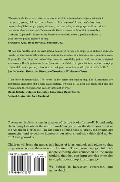Summer in the Forest is the fourth in a series of seasonal picture books for pre-K to early elementary children about the natural world, in particular the deciduous forest of the American Northeast. The Summer book illustrates the vertical layers of a forest starting with an eagle and squirrels in the high canopy, moving down past a sleeping raccoon and her kits and a pileated woodpecker chiseling a snag, to a cool stream-side where turkeys and a bear family amble past. The light and air change from the pale blue and greens of open sky with a breeze in the high branches to the cool dark greens of the quiet and moist conditions at ground level. Children are encouraged to look both up and down when in the forest and to imagine life among the branches as well as on the ground. The language of these books is lyrical, the images are engaging and sometimes humorous but always realistic - think field guides for 3- to 8-year-olds. In this book series, children will learn the names and habits of common forest animals and plants as they are seen in their natural settings. By engaging children's innate curiosity and interest in the natural world they are able to make a step toward understanding more complex ecological principles in simple, age- appropriate language. We publish in hardcover, paperback, and audio ebook.